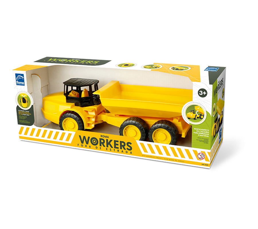 Prepare o terreno, porque a diversão pesada chegou! Com a Roma Workers – Fora da Estrada, a obra nunca para! A caçamba é articulada, levanta e abaixa de verdade para você bascular tranquilamente, pronta para transportar areia ou pedrinhas, possui rodas grandes que encaram qualquer terreno, esse caminhão é o parceiro ideal para explorar quintais, praças e areia, um super brinquedo para quem adora construir histórias cheias de ação!