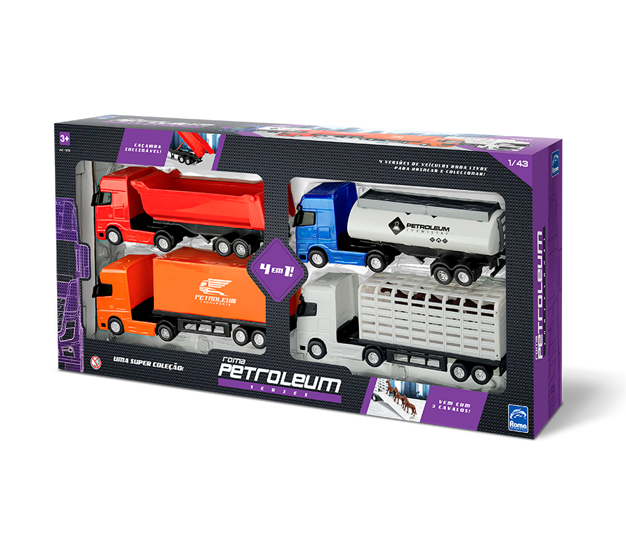 Pronto para encarar as estradas? Com a Roma Petroleum Series, a brincadeira ganha potência total! São caminhões incríveis, cheios de estilo e personalidade, prontos para transportar cargas importantes, enfrentar desafios e rodar por quilômetros de aventuras. Cada modelo tem um visual único, tanque, baú, haras e caçamba, para que as crianças possam explorar diferentes histórias, como grandes motoristas e verdadeiros profissionais da estrada! Com design moderno, cores vibrantes e rodas livres para muita ação, a Roma Petroleum Series é diversão garantida para pequenos apaixonados por caminhões e grandes jornadas! Acelere para um mundo cheio de histórias e descobertas!