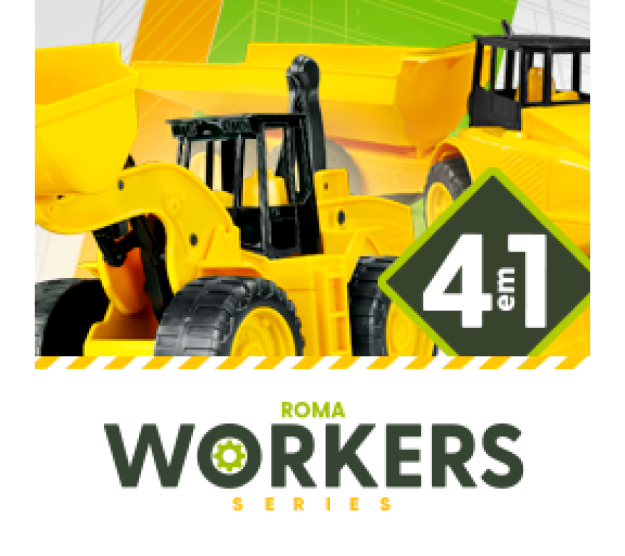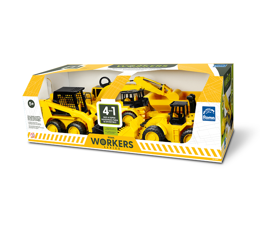 A construção vai começar em grande estilo com o Conjunto Roma Workers 4 em 1! São quatro super máquinas de obra – escavadeira, carregadeira, bob workers e fora da estrada – prontas para encarar montanhas de areia, construções épicas e qualquer missão no canteiro da imaginação! Cada veículo possui partes articuladas para brincar e você conseguir comandar a sua super máquina! Estimulando coordenação motora, criatividade e brincadeiras cooperativas. Perfeito para pequenos engenheiros que adoram desafios e aventuras sobre rodas! Quem comanda a obra é você!