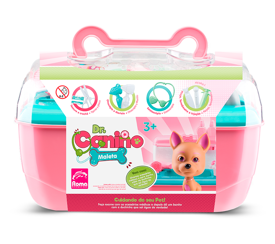 Um banho cheio de amor e fofura! É hora de cuidar com carinho do seu amiguinho de quatro patas! A Dr. Canino Maleta Rosa transforma o momento do banho em uma brincadeira encantadora, com tudo o que o pequena veterinária precisa para deixar o pet limpo, cheiroso e feliz. A maleta se abre e vira uma banheira superfofa, vem com duchinha que funciona com água de verdade, com acessórios como escova, shampoo, secador, além dos acessórios médicos, como estetoscópio, seringa, martelinho entre outros. Tudo pensado para um dia de spa completo! Depois da diversão, é só guardar tudo dentro da maleta e levar para onde quiser. Dr. Canino Maleta Rosa: cuidar nunca foi tão divertido!