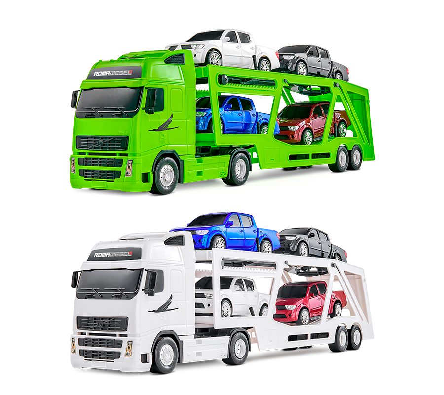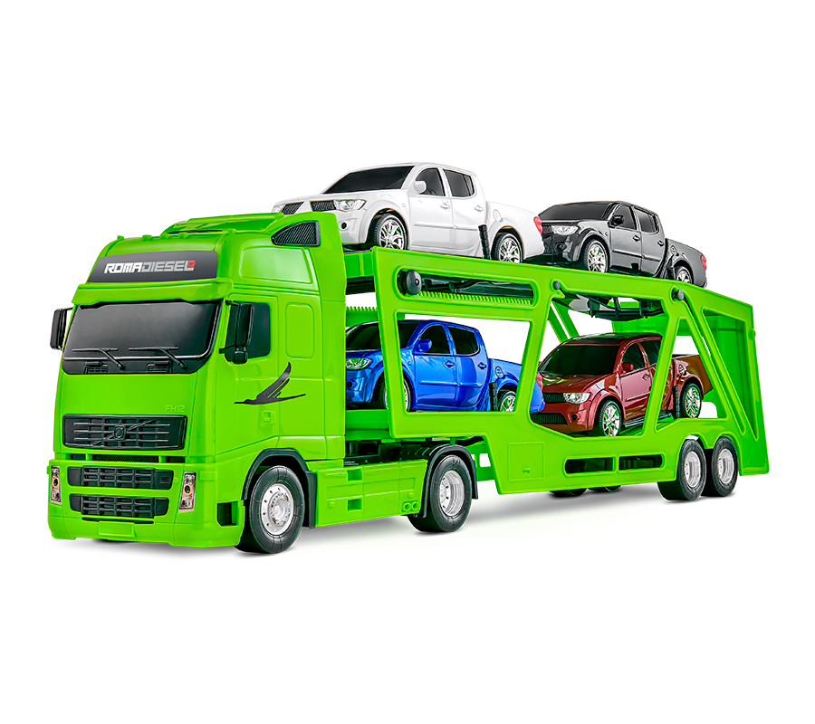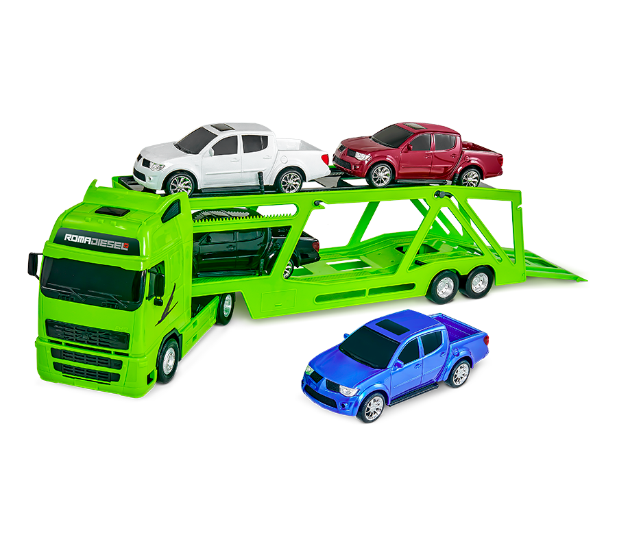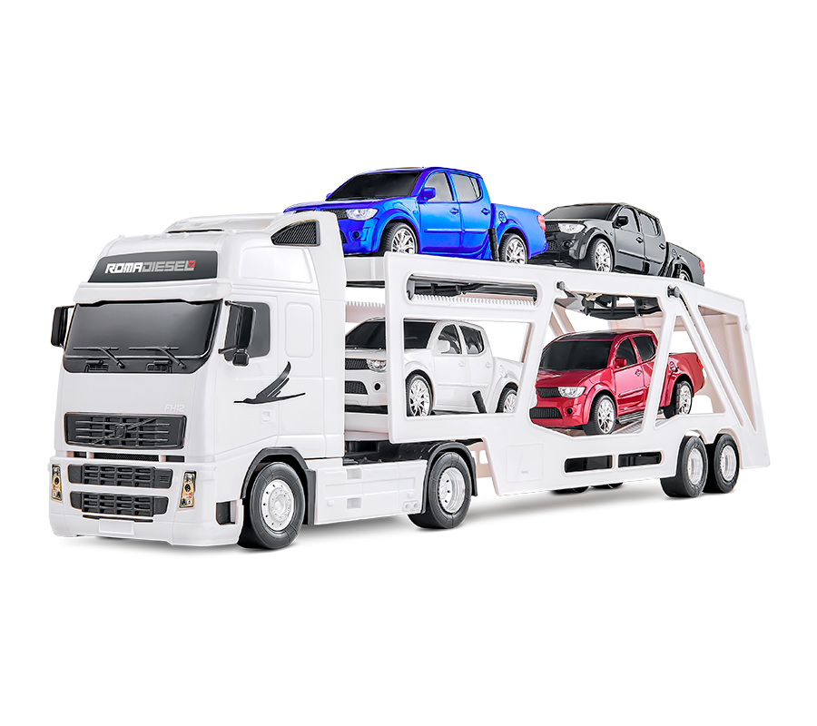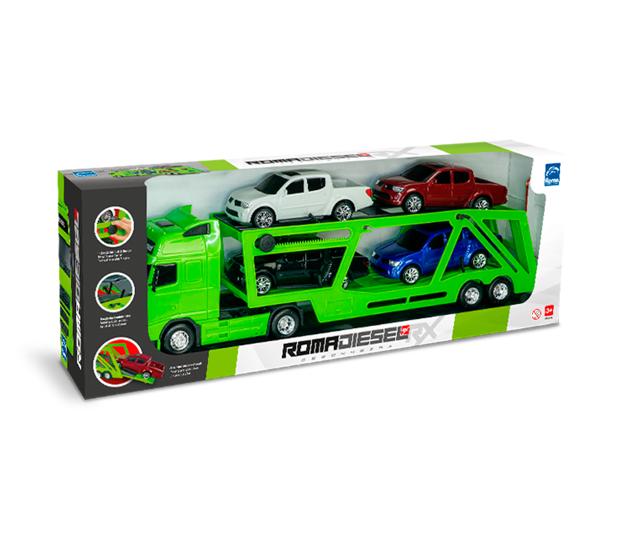 Prepare-se para pegar a estrada com potência total! A Roma Diesel – Cegonheira é o caminhão dos sonhos para quem ama o mundo sobre rodas. Forte, imponente e cheia de estilo, ela carrega sua frota de carrinhos com segurança e muito realismo, pronta para longas viagens e grandes entregas! Com design robusto e repleto de detalhes, essa super cegonha vem com diversos veículos a bordo, possui quase 1 metro de comprimento, vem com 4 Pick-ups de cores sortidas, possui rampa móvel e sistema de trava das Pick-up na rampa. O motor da brincadeira não para: é só acelerar a imaginação e levar os carros para novas cidades, corridas e destinos incríveis! Um brinquedo completo que transforma qualquer brincadeira em uma verdadeira expedição sobre rodas!