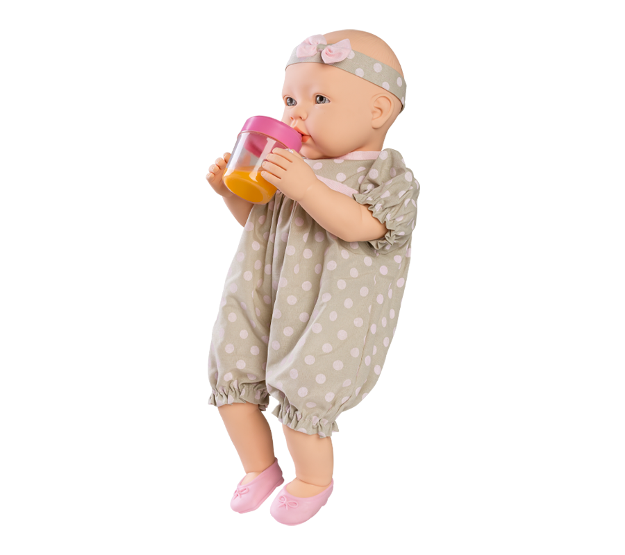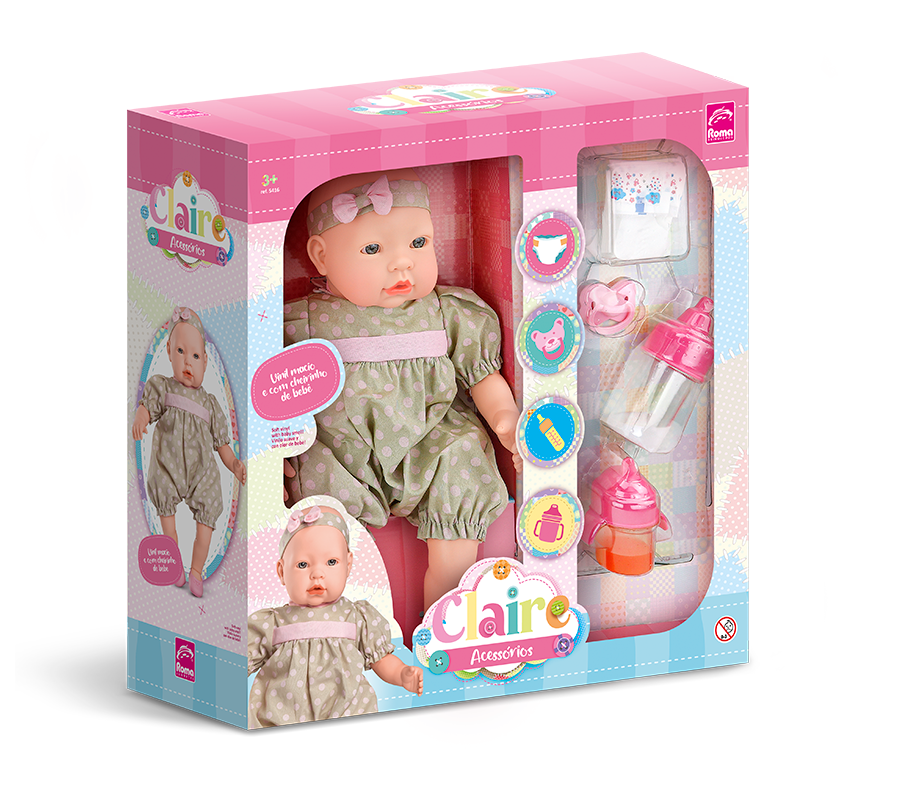 A Claire chegou para conquistar corações com seu jeitinho doce e look superdelicado! Com um lindo macacão de bolinhas e tiara combinando, ela é o retrato da fofura e da elegância. Acompanha acessórios que tornam a brincadeira ainda mais completa, ela é charmosa e com uma roupa super fofa. A "Claire Acessórios" vem com suqueira, uma mamadeira com líquido de verdade, além de fralda e chupeta, Ítens essênciais para você cuidar da sua bebê! Perfeita para inspirar momentos de afeto, imaginação e descobertas, Claire é a companheira ideal para quem ama brincar de cuidar com muito amor!