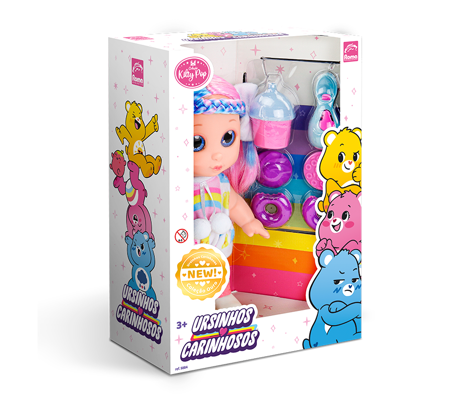 Diretamente do Reino dos Ursinhos Carinhosos, a Kilty Pop – Ursinhos Carinhosos chegou trazendo todo o encanto das nuvens mágicas, dos corações cintilantes e dos abraços mais doces do mundo! Com seus cabelos coloridos em tons de algodão-doce e seu look cheio de arco-íris e estampa dos Ursinhos Carinhosos, ela espalha amor, amizade e boas energias por onde passa! Seus acessórios encantadores, como o sorvetinho, as rosquinhas e o pente, completam a diversão em um mundo cheio de cores e imaginação. Cada brincadeira com Kilty Pop é uma viagem ao mundo mágico dos Ursinhos Carinhosos — onde cuidar dos outros, sorrir e sonhar são as maiores aventuras!